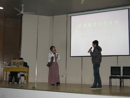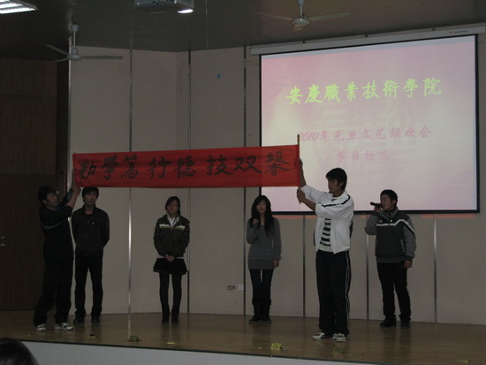 一年一度的元旦师生联欢会是我院传统的文化活动之一。为举办好2010年元旦师生联欢会,从11月下旬起,院团委就着手选拔节目主持人,组织各系部准备节目。1211晚,院团委、学生会进行晚会节目初选,各系部、各学生团体选送的37个节目先后登台。广大同学热情高涨,积极参与,选送的节目形式多样,内容健康向上。整个活动持续近4个小时。