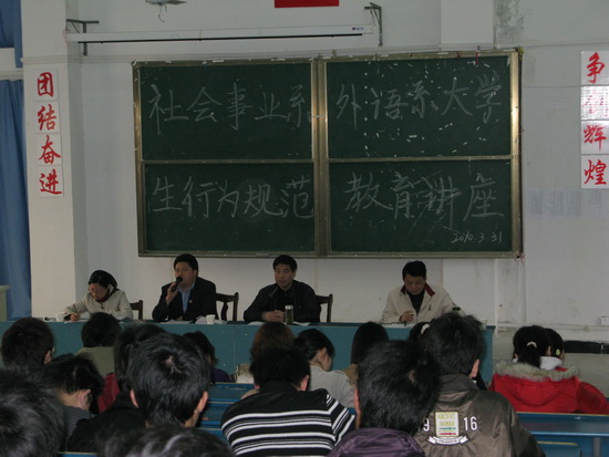 331下午两点,社会事业系、外语系在2号教学楼316教室举行大学生行为规范教育讲座。该系主任王诚、副主任石望东、全体辅导员、班主任及全体男生参加了本次讲座。讲座由该系团总支书记汪江红主持。