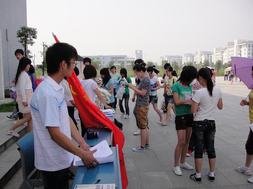 5月25日12点30分,300多名参加个性及能力测试的同学准时来到图文信息中心四楼机房,在专业老师的安排下规范的进行相关测试活动,整个机房安静有序,所有参加测试的同学都认真按照要求在指定时间内完成测试。下午两点,大学生心理健康协会在二号教学楼前开展了心理健康知识宣传及大学生个性倾向调查活动。心理健康教研室黄秀娟老师还带领心理健康协会的同学一起做起了一些有趣的心理游戏活动。学生处副处长彭金德和团委副书记余锋也亲临现场观摩了整场活动。