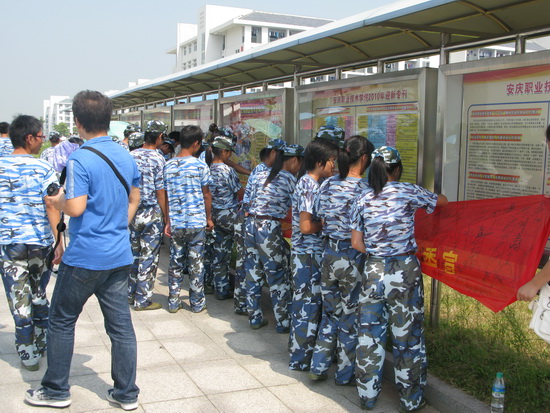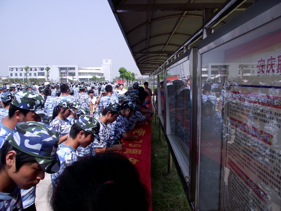为纪念“九•一八”事变79周年暨第10个全民国防教育日,9月18日上午,院团委组织学生开展爱国宣誓签名活动,纪念这个特殊的日子。短短的半个小时,9.18米长的“牢记历史,勿忘国耻,珍爱和平,兴我中华”条幅上签满了密密麻麻的名字。正在参加军训的新生、军训教官热情高涨,纷纷在条幅上签上了自己的名字。