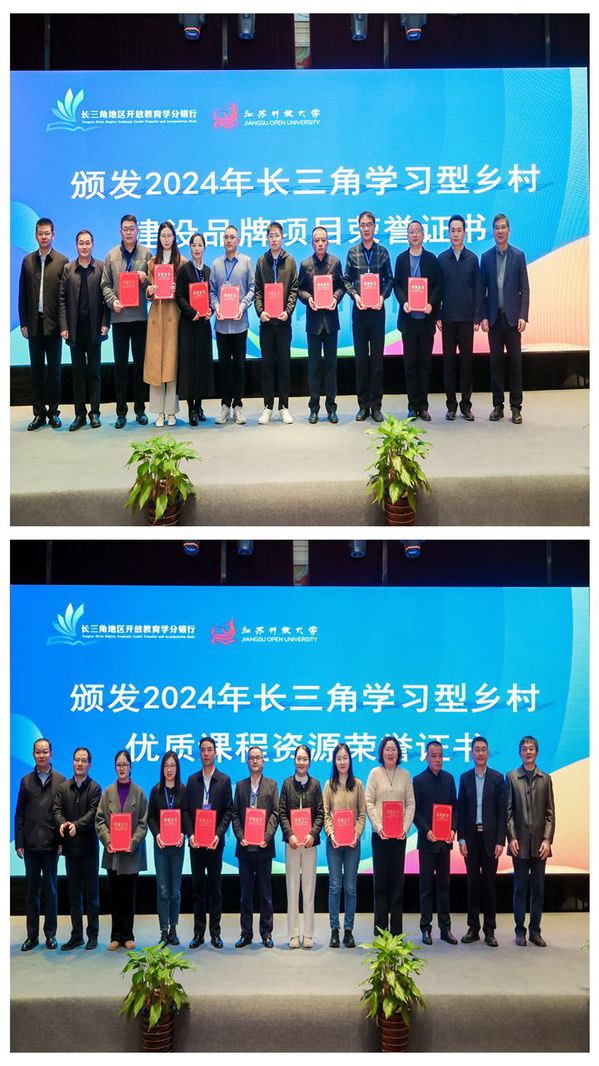 会议期间,对长三角地区开放教育项目和课程进行表彰。我校“职业教育+乡村振兴协同发展”也在众多参选项目中脱颖而出,荣获长三角学习型乡村建设品牌项目。“小红稻机械化栽培技术”“村集体经济”“农村宅基地管理政策解读”三个课程获长三角学习型优秀课程资源奖。