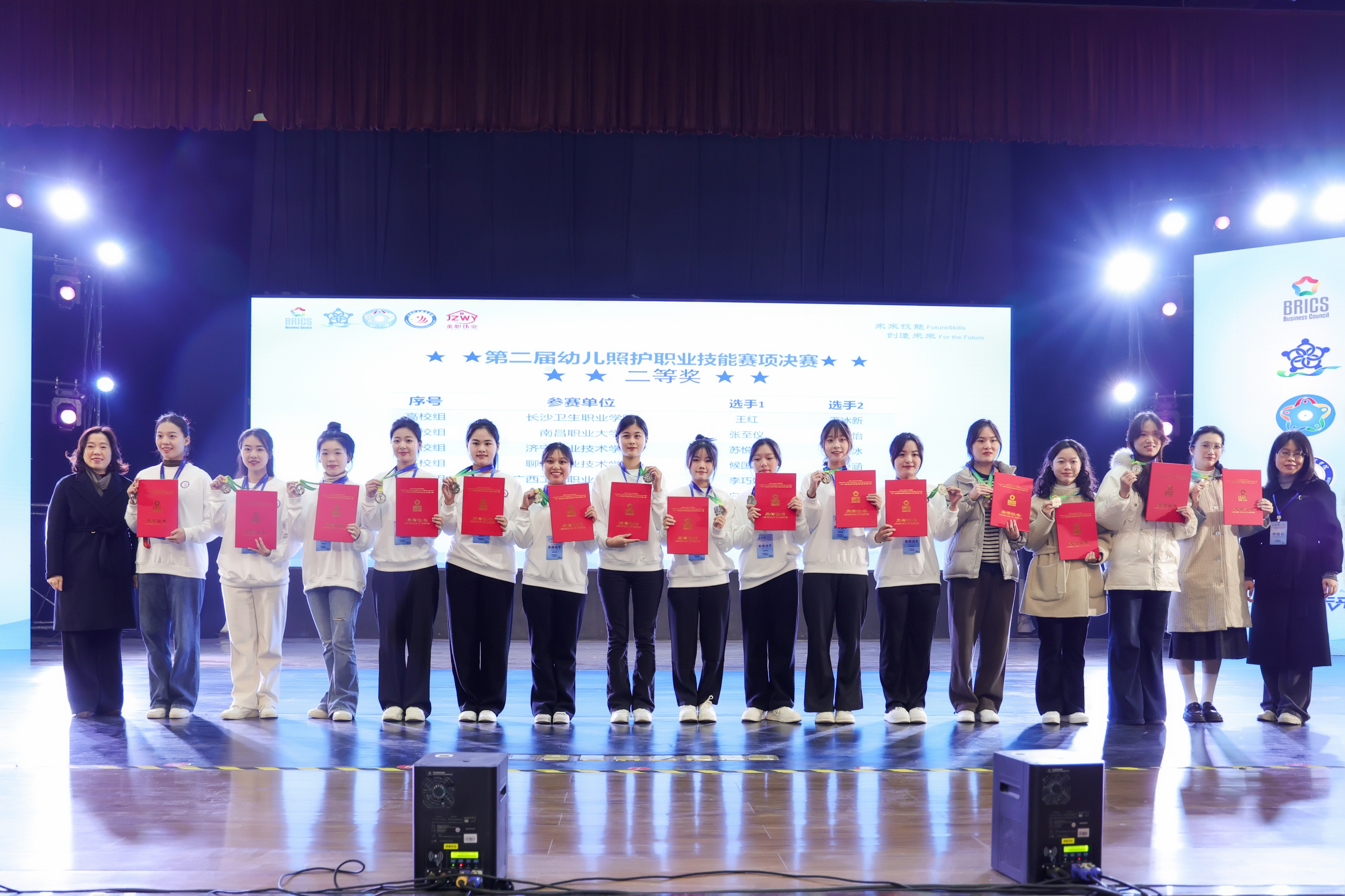 12月10日,2024年全国一带一路暨金砖国家技能发展与技术创新大赛幼儿照护赛项全国总决赛在湖南岳阳圆满落幕。我校婴幼儿托育与服务管理专业牛冰洁与余璇同学,比赛中荣获银牌,指导老师张芳和刘艳荣被评为优秀指导老师,专任教师周佳欣受邀担任总决赛实操环节平行组裁判,学校校被授予优秀组织奖。