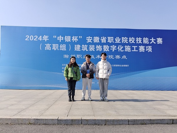 1月3日至1月5日,由安徽省教育厅、安徽省人力资源和社会保障厅主办的2024年“中银杯”安徽省职业院校技能大赛(高职组)建筑装饰数字化施工赛项在滁州职业技术学院开赛。我校建筑装饰工程技术专业黄妍老师和学生祖普辉、余浩鸿团队喜获一等奖,张干老师和学生马凌云、汪龙三团队获得三等奖。