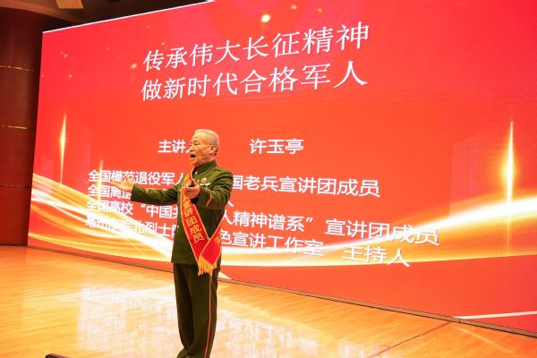 全国模范退役军人、皖北烈士陵园许玉亭红色宣讲工作室负责人许玉亭作题为《中国共产党人精神谱系——长征精神》的专题报告。李五一宣读了我校毕业生2025年春季从迎江区入伍的预定新兵名单。六个二级学院的主要负责人分批次为预定新兵佩戴入伍绶带和红花。预定新兵们向家长代表敬献鲜花,表达对家长的感谢。