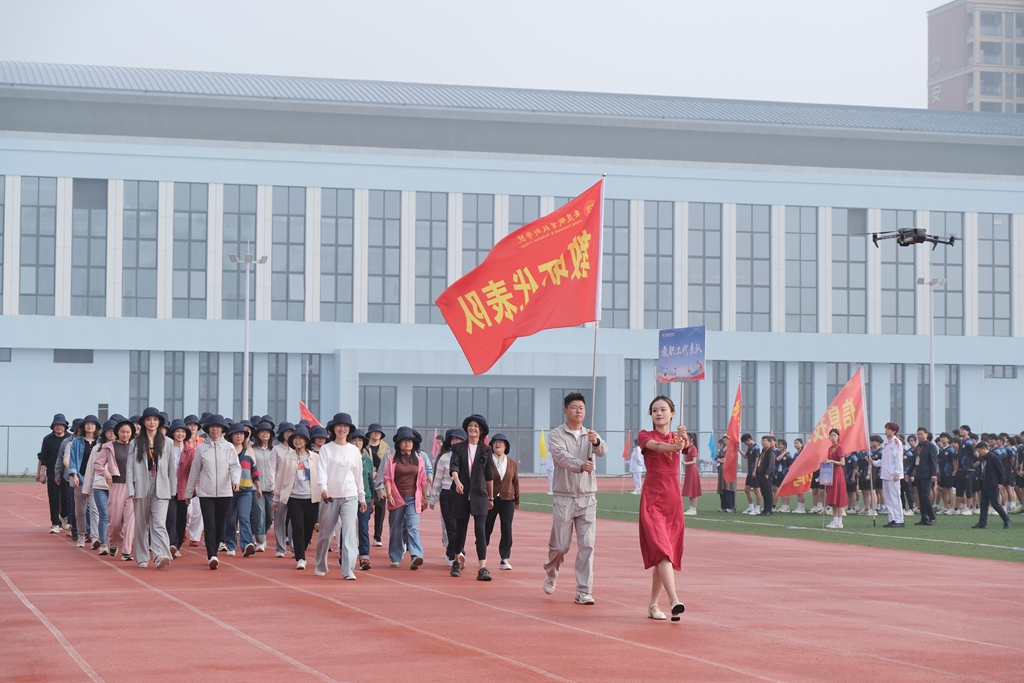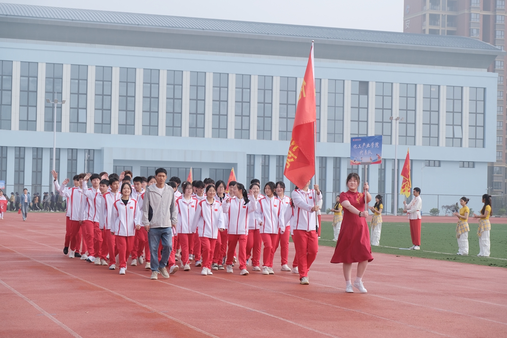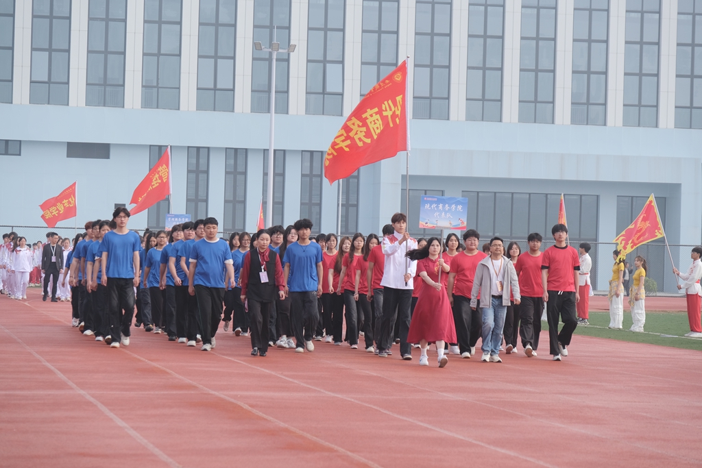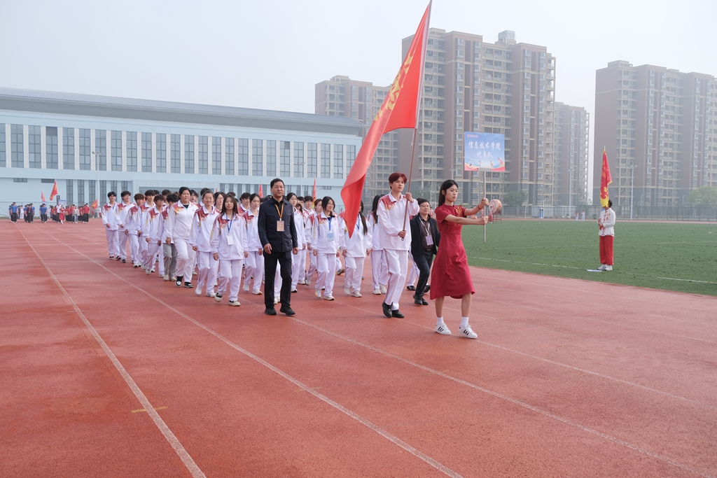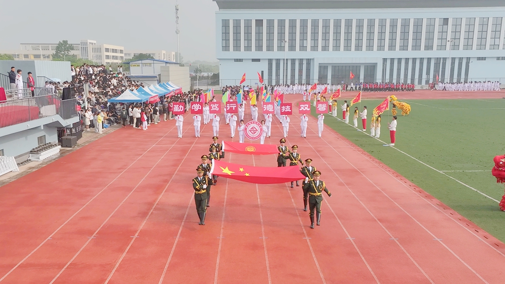 伴随着激昂的运动员进行曲,各代表队依次入场。国旗队庄严开道,校旗、校徽、校训队紧随其后,彩旗方阵迎风飘扬,七个二级学院代表队步伐整齐、口号嘹亮,彰显专业特色与青春风采。裁判员与教职工代表队压轴亮相,以沉稳的姿态展现公平执裁的决心。全体师生肃立,齐声高唱国歌,雄壮的旋律响彻田径场。