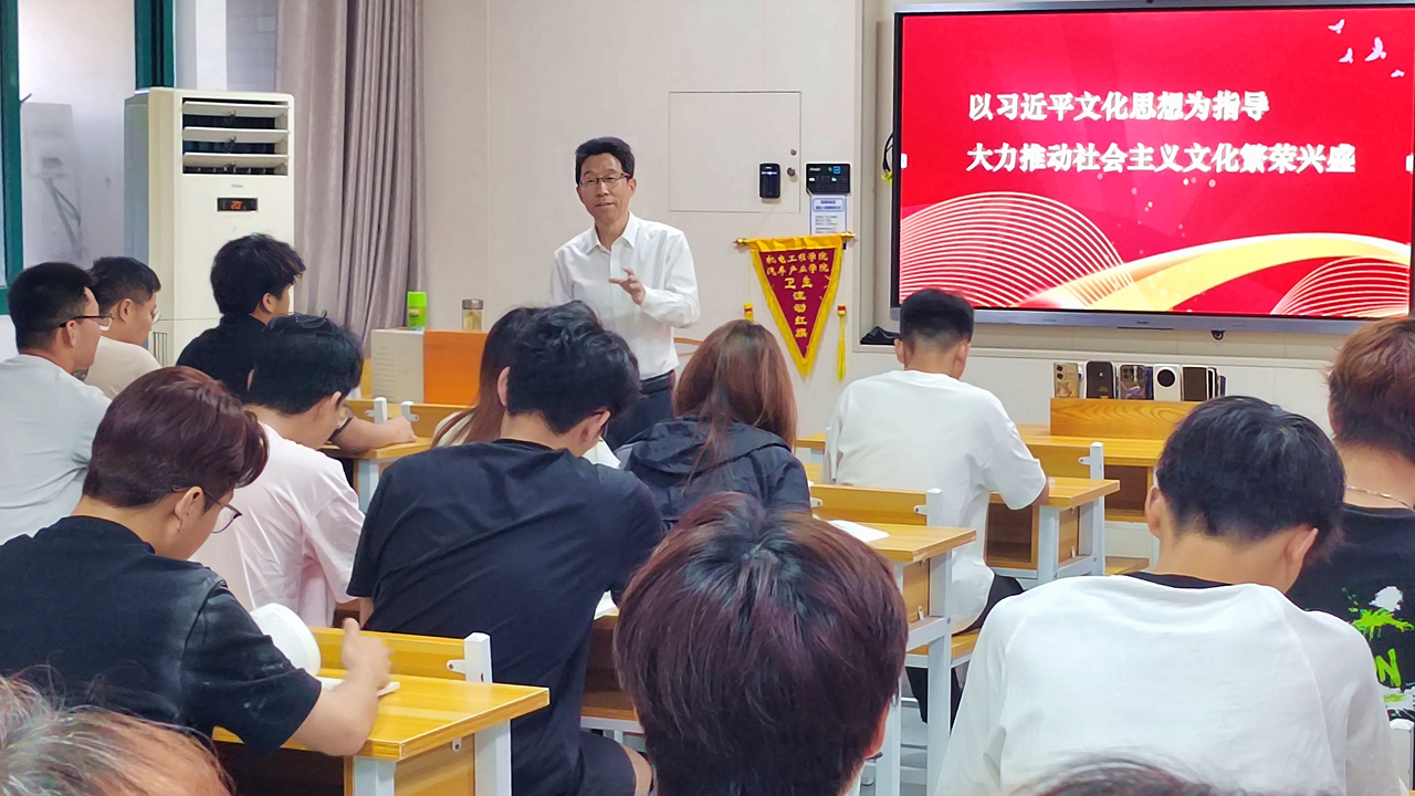 5月13日,校党委副书记、校长毕明生在1号教学楼204教室为24级新能源汽车技术5班的同学们讲授《以习近平文化思想为指导 大力推动社会主义文化繁荣兴盛》专题形势与政策课。