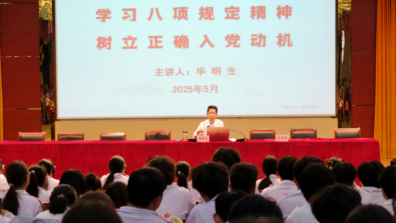 5月28日晚,在校图文信息中心一楼报告厅,校党委副书记、校长毕明生以《学习八项规定精神 树立正确入党动机》为题为我校党校第36期入党积极分子培训班讲授第一课。校党委委员、组织部部长高润霞主持,校党委组织部、校团委负责同志,各二级学院组织员以及全校300名入党积极分子参加学习。