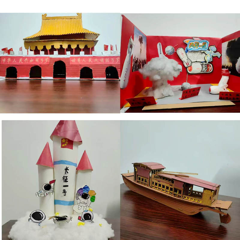 将革命历史与环保理念相结合,作品采用再生纸、废弃纸板等环保材料,通过立体折纸、拼贴等手法,巧妙地将革命历史融入立体模型中。从红船模型到长征一号火箭的重现,每一件作品都承载着厚重的历史感。手制的天安门场景,更是生动展现了中国的红色文化,令人肃然起敬。通过立体化的呈现方式,学生们让革命史跃然纸上,让中国红更加鲜艳夺目,同时也增强了自身的爱国主义情怀和历史使命感。
