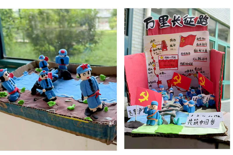 泥塑作品以精湛工艺再现长征壮举,蓝灰军装的红军队伍蜿蜒行进,他们或扛枪前行,或相互搀扶,展现了长征途中的艰辛与团结。红旗招展,生动塑造了飞夺泸定桥等长征途中的关键场景,红军战士们或攀爬铁索,或奋勇冲锋,人物群像栩栩如生,展现了红军不畏艰难、勇往直前的革命精神。任课教师韩蕾说道:“长征精神从不是教科书上的铅字,而是可以用温度感知的生命记忆,这些浸润着信仰的泥塑作品,应成为我们人生路上的精神火种。”