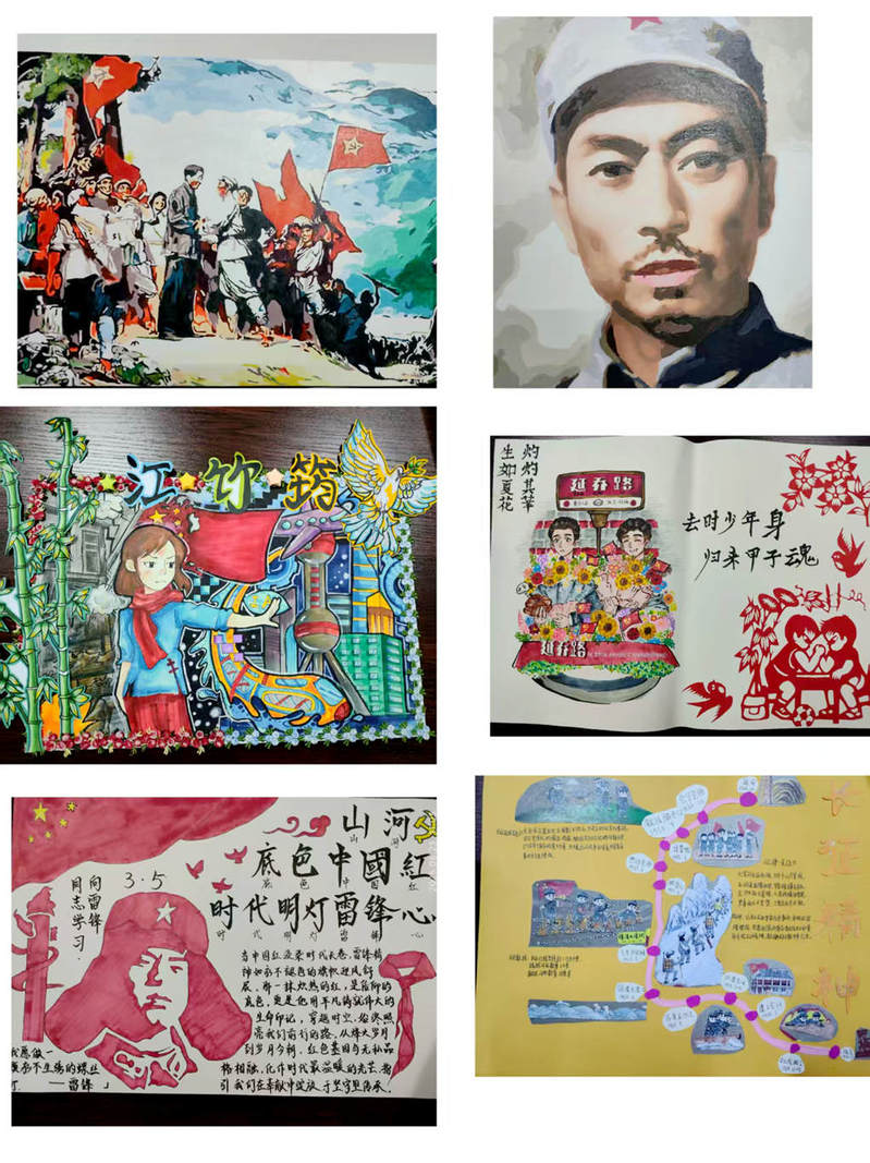 颜料淬炼英雄色,学生们的画笔下,革命历史跃然纸上。红旗招展,竹子坚韧,象征着革命的不屈与希望。线条勾勒信仰光,英雄人物肖像栩栩如生,延乔路的少年身影与归来甲子魂,在画中重获新生,每一抹色彩,都是对历史的铭记;每一根线条,都是对信仰的坚守。在创作中,学生们让英雄精神得以传承,让红色基因在新时代绽放光芒。