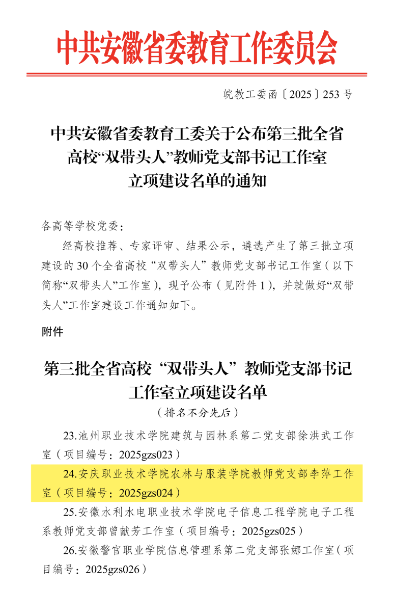 近日,中共安徽省委教育工委印发《关于公布第三批全省高校“双带头人”教师党支部书记工作室立项建设名单的通知》,遴选确定30个第三批全省高校“双带头人”教师党支部书记工作室。其中,我校农林与服装学院教师党支部书记李萍领衔的“李萍工作室”成功获批,这是学校在党建工作领域取得的又一重要成果。