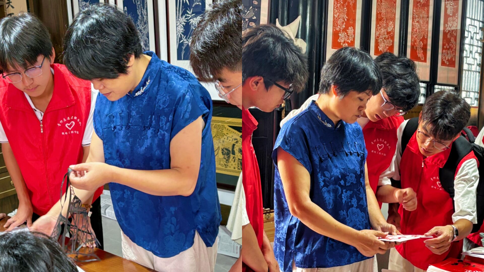 吴笑梅老师向团队成员展示了多幅经典作品,详细介绍了剪纸的基本技法、不同纹样的丰富寓意,并分享了她如何将日常生活中的观察提炼转化为艺术表达的创作心得,让在场学生亲身感受到传统剪纸技艺的独特魅力。当问及剪纸艺术的传承问题时,吴老师向我们分享了她多年来坚持剪纸教学、积极举办展览的经历与实践。她特别向我们表达了她的愿景:希望通过讲座、展览、互动体验等多元化的方式,让更多人了解剪纸,尤其是吸引年轻一代参与进来,让这门古老的艺术在新时代焕发出新的生命力。让团队成员感受到非遗传承背后的文化自信与责任担当。