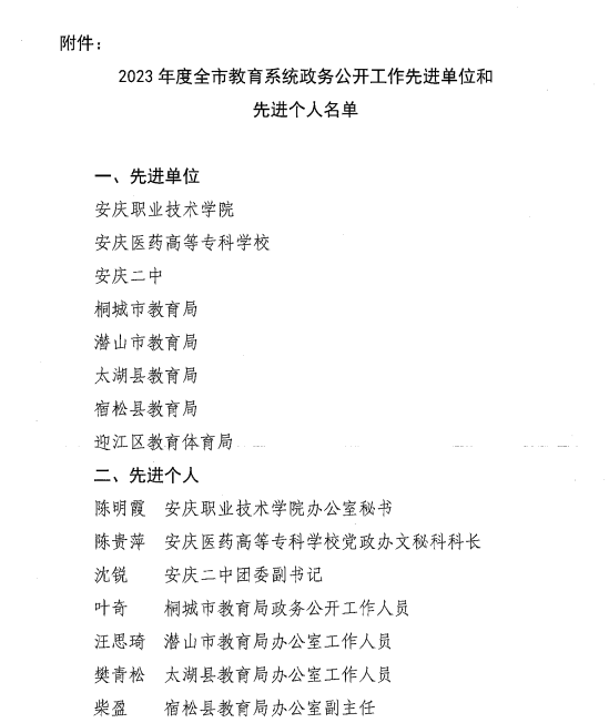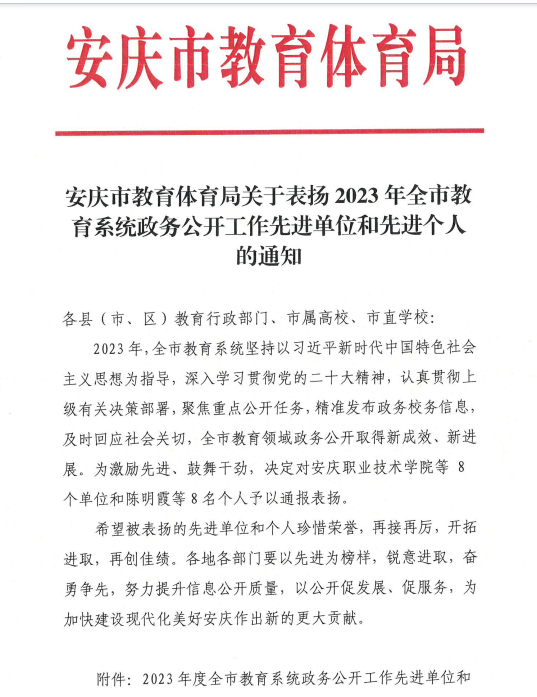 日前,2023年度全市教育系统政务公开工作先进单位和先进个人评选结果揭晓,我校获评先进单位,陈明霞老师荣获先进个人荣誉称号。