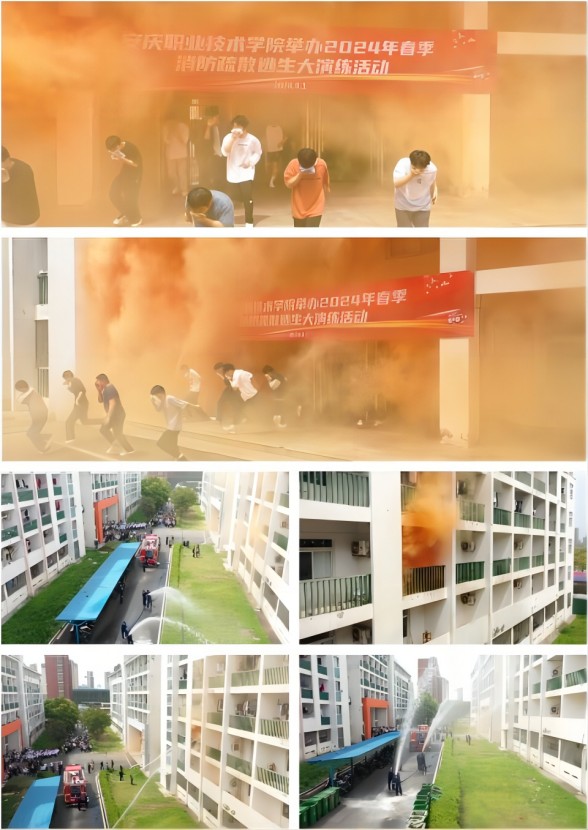 面对面:现场宣传消防安全 讲座邀请了消防支队综合管理科科长李杰主讲,公寓楼前广场上,他重点介绍了火灾现场正确逃生自救办法以及灭火器的种类和使用方法等,并现场演示了在火灾中如何进行自我保护和应急扑救。 练再练:火场逃生自救外援 12点30分,虚拟场景“6号学生公寓楼三楼某房间起火”,“烟雾”弥漫楼道和阳台。随着警报响起,火场逃生演习正式启动,240名参演学生在工作人员的组织和引导下用湿毛巾捂住口鼻、弯腰低姿穿过浓浓烟雾,沉着有序的从四个疏散楼梯撤离“火灾”现场,到达安全地带,整个撤离过程井然有序。接警后公寓楼外,迎江大队秦潭湖消防救援站灭火指战员协同学校安保队员一起训练有素地连接水管、迅速铺设消防水至火点阳台下方,最后在消防车和校内消火水枪强大的水柱压制下,“火势”迅速被扑灭。精彩的展示赢得在场观摩师生员工的阵阵掌声。