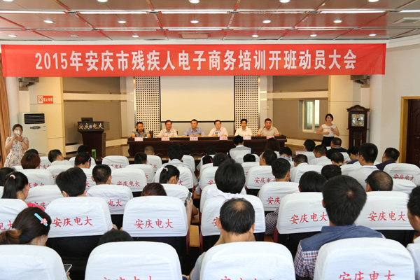 6月24日下午,由安庆市残疾人联合会主办,我院承办的2015年全市残疾人电子商务培训班在安庆电大报告厅开班。院长孙晓峰、副院长毕明生,市残疾人联合会理事长童宏奎、副理事长黄勇,市商务局副局长汪传华,市特教学校副校长严会及市人社局、财政局、残联等相关科室负责同志出席开班仪式。来自桐城市,怀宁、枞阳、潜山、望江、宿松县和宜秀、大观区的100余名参训学员参加了开班仪式。