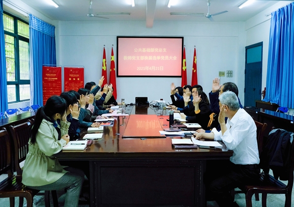 4月21日下午,在雄壮的国歌声中,公共基础部党总支隆重地召开了教师党支部换届选举党员大会。会议由党总支书记张林同志主持,全体党员参加了会议。