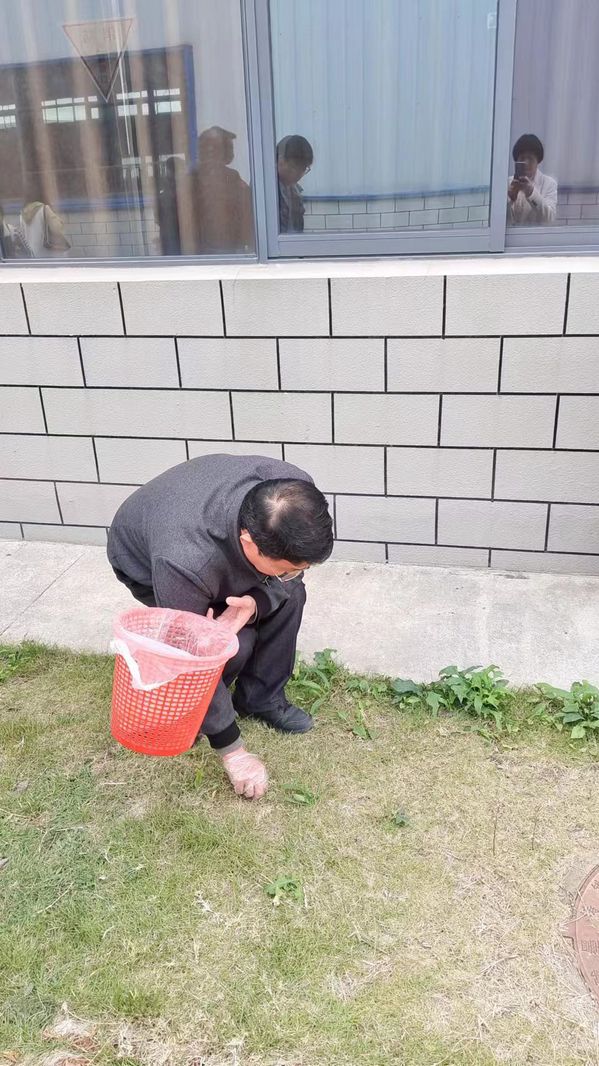 在近一个小时的劳动过程中,党员同志和入党积极分子,低着头、弓着腰,沿着体育馆的外围与运动场的四周,一路寻找、拾捡散落在草丛里、栅栏边、墙脚处不易清扫的诸如烟头、果皮类垃圾。这支义务清洁操场的队伍,吸引了正在运动场健身运动师生的关注,引起了不少学生的驻足探望。