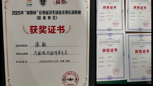 由安徽省羽毛球协会主办的2025年“摘要杯”安徽省羽毛球业余俱乐部联赛(皖南赛区),于10月18-19日在铜陵市体育中心落幕。本次赛事吸引全省50多支代表队参赛,设A、B、C、D、E五个组别,采用单循环赛制与淘汰赛制相结合的方式进行。我校体育教研室张颢老师凭借过硬技能与敢打敢拼的劲头,经过激烈角逐,最终斩获团体第五名的佳绩。
