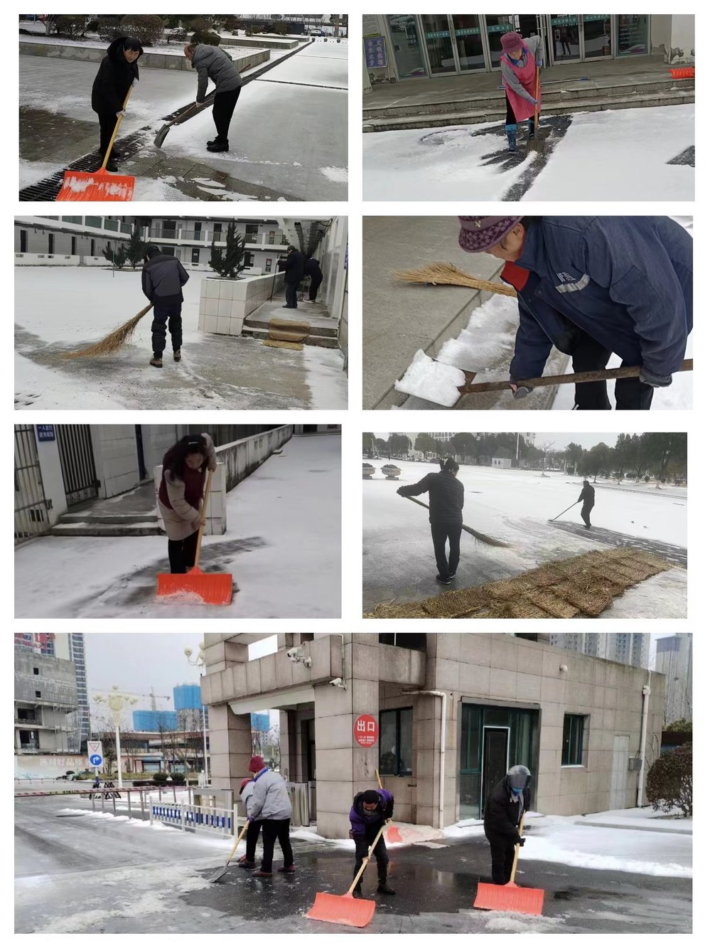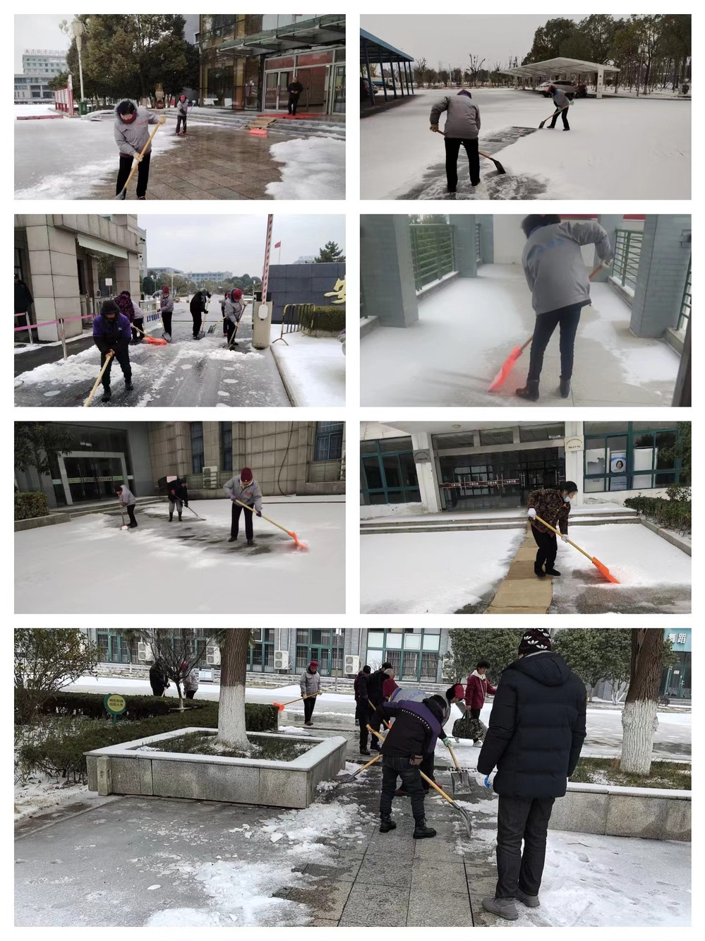 凛冽的寒风中,大家拿起铁锨、铲雪板、扫帚,带着麻袋、草垫,按照铲雪、碎冰、撒盐、铺垫子的流程,在主要干道、教学区、宿舍区、办公区、图书馆、食堂等重点区域开展清扫工作。