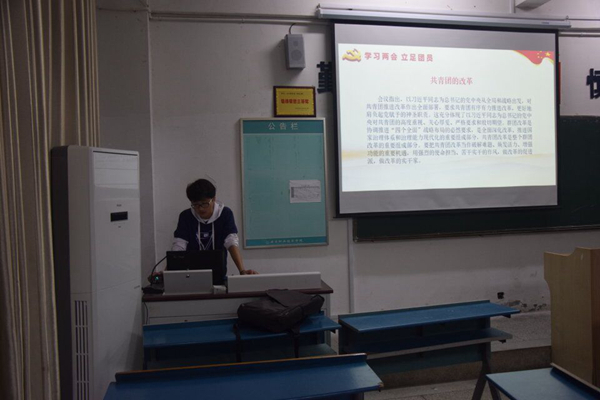 会上,各班班委首先对自己本班近期的情况进行了报告和汇总,接着,活动负责人采用PPT的演讲形式向同学们讲解了两会的内容。各班同学们认真聆听,仔细笔记,并和身边的同学进行了讨论。随后由各班级的班委逐个发言,对本次学习两会的内容和精神进行了总结,并赢得了热烈的掌声。