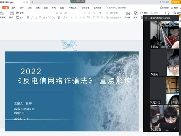 紧扣主题,掀起学习热潮。2022年12月4日是第九个国家宪法日,也是中国现行宪法公布施行四十周年。12月4日至10日是第五个“宪法宣传周。宣传周活动的主题是‘学习宣传贯彻党的二十大精神,推动全面贯彻实施宪法’”。12月4日上午,全体辅导员老师通过线上会议方式,带领全体学生一起学习宪法内容。同学们端坐在电脑前,认真聆听辅导员介绍宪法知识,感悟宪法精神。