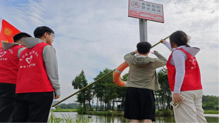 在养老中心,学生们为老人们打扫房间、整理衣物,与他们亲切交谈,倾听他们的故事,分享他们的喜怒哀乐。这些互动不仅为老人们带来了欢乐,也让学生们更加深刻地理解了尊老爱幼的意义。在水域安全警示设置环节,学生们在池塘、河边插上了醒目的警告牌,并绑上了救生圈等救援物品。通过这样的预防措施和警示,希望能够增强大家的安全意识,从而避免悲剧的发生。同时,学生们还向农户普及了垃圾分类和急救知识,提升了村民的生活质量和自救能力。