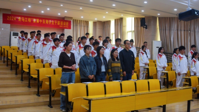 仪式正式开始后,全场起立,在音乐伴随下齐唱团歌。团总支负责人宣读了本次青马工程培训班的培训计划,学生代表韩信代表全体学员做表态发言,表示要有爱国情怀,以梦为马,践行使命,勇于担当,争做有理想、敢担当、能吃苦、肯奋斗的新时代青年楷模。