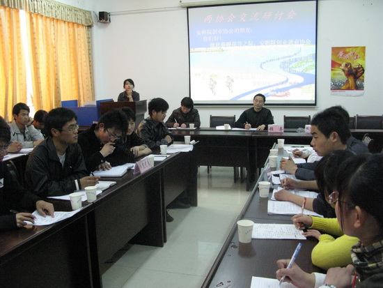 为促进学生团体建设,架起安庆市高校学生团体间交流与合作的桥梁,2009年3月18日下午,我院创业就业协会与安庆师范学院创业协会首届研讨交流会在院行政楼招聘室举行,两协会负责人及会员代表共30人参加会议。此项活动得到了院招生就业处、院团委、学生处的大力支持,院招生就业处副处长胡忠东、学生处副处长许迪楼、院招生就业处张铮老师出席会议。