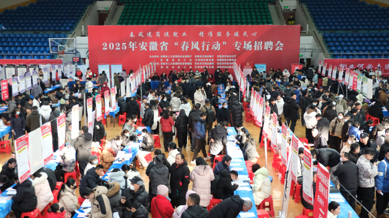 2月9日上午,安徽省2025年“春风行动”新春大型招聘活动在安庆市体育馆盛大开场。我校党委副书记、校长毕明生、党委副书记李克让率队,招生就业处、各二级学院相关负责同志、专业建设负责人、毕业班辅导员等参加活动。
