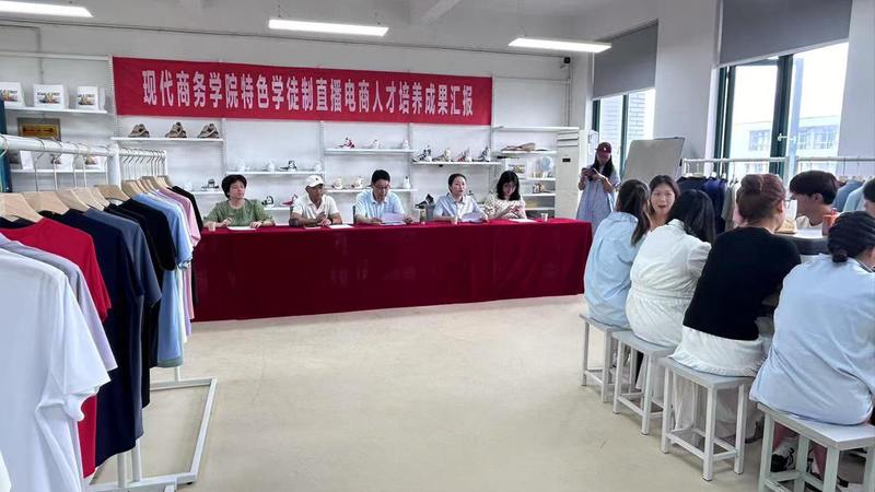 现代商务学院2024级云霁电商校企合作订单班自开班以来,积极构建“企业主体+学院协同”的育人框架,采用视域电商营销中国特色学徒制教学模式开展实践教学。企业师傅指导学生开展新媒体电商直播知识、模拟直播实训及考核、企业带货实战等3个项目的实践教学,多次带领学生赴安庆筑梦新区电商产业园和宿松县省际智慧云仓电商示范园体验直播业务。为检验中国特色学徒制校企合作订单班教学效果,6月12日上午,现代商务学院在校企共建实训室举办特色学徒制直播电商订单班人才培养成果汇报会。现代商务学院院长金启胜,安徽云霁电商公司负责人、安徽省产业教授汪义德,以及现代商务学院教学负责人、相关专业负责人、订单班师生代表参加。