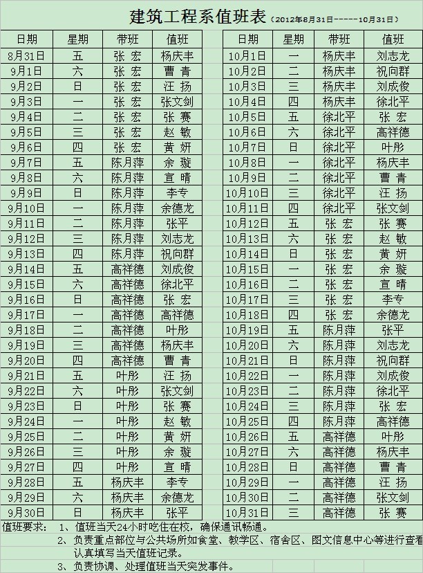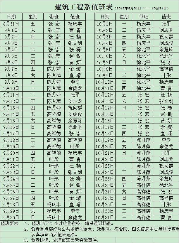 建筑工程系2012年9-10月值班安排表