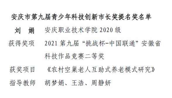 本次评选在安庆市委、安庆市政府的支持下,由安庆市科协、安庆市青少年科技创新市长奖评审委员会举办,我校学子刘娟凭借2021第九届“挑战杯-中国联通”安徽省科技作品竞赛二等奖的作品《农村空巢老人互助式养老模式研究》(指导教师:胡梦娟、王浩、周静妍)在众多科技作品中脱颖而出。
