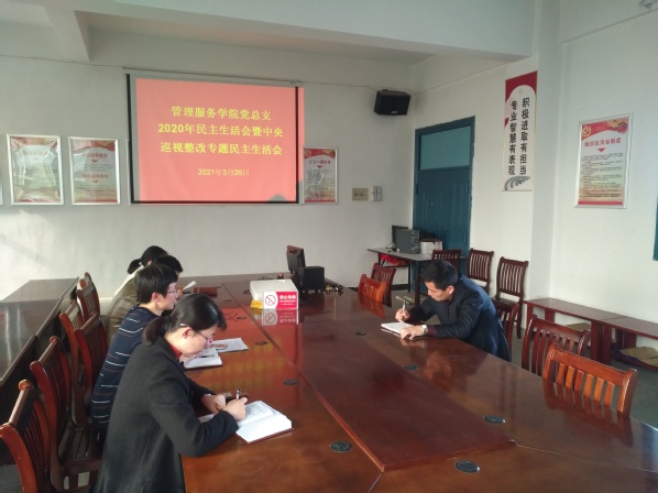 3月26日下午,管理服务学院党总支在3号教学楼三楼会议室召开了2020年度民主生活会暨中央巡视整改专题民主生活会,校党委委员沈良生到会指导。会议由院党总支书记高润霞主持,总支班子成员参加会议。