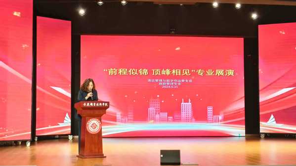 管理服务学院院长陈颖致辞,代表学院师生感谢莅临活动现场的企业来宾、学校相关部门等对管理服务学院专业建设、实习就业、学生成长成才等各项工作的热忱关心和大力支持;寄语即将走上实习就业工作岗位的2022级旅游酒店专业同学,要求大家树立正确的择业观和就业观,积极转变身份角色,尽早树立职场意识;坚定信念遵守职业道德,勇敢追求人生理想;深入了解安庆历史人文、熟悉安庆产业企业、关心安庆建设发展,以实际行动助力美好安庆建设;同时对2023级同学提出殷切希望,要求大一同学在校期间努力学好专业理论知识、积极提升专业操作技能、全面丰富人文道德素养,真正践行“勤学笃行 德技双馨”的校训精神。安庆会展中心会议中心酒店总经理丁敏代表企业发言,她指出未来的企业竞争是人才的竞争,学习能力和专业技能是高职同学们成功的核心竞争力,希望同学们不断更新知识、提高综合素养,志存高远脚踏实地,勇往直前未来可期 。