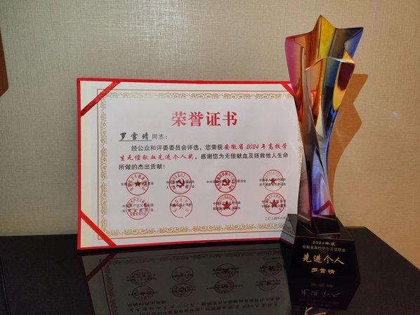 我校罗雪晴获安徽省高校学生无偿献血先进个人