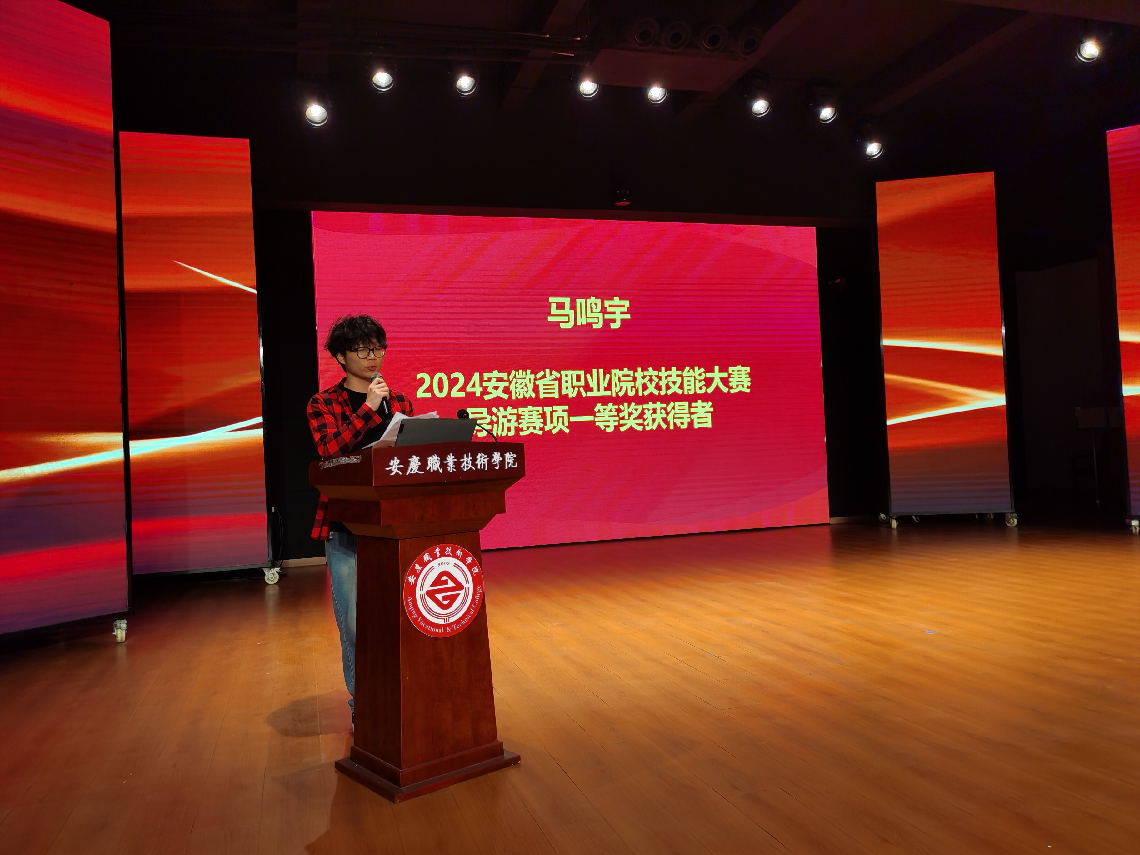 经验分享环节,2024年安徽省职业院校技能大赛导游服务赛项一等奖获得者马鸣宇(2023级旅游管理1班)现场演示竞赛流程,解析文化阐释情境应对等评分要点;2024年挑战杯中国大学生创业计划竞赛银奖团队成员刘敏杰(2023级智慧健康养老服务与管理1班)以商业计划书迭代过程为例分享了自己的参赛心得。