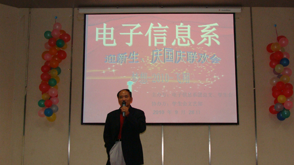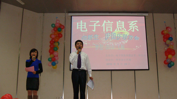 秋风送爽,丹桂飘香。在这金色的季节中电子信息系团总支、学生会于2010年9月28日在图文信息大报告厅举办“迎新生·庆国庆”联欢会。