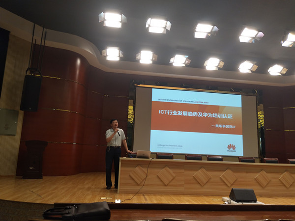 本次讲座由奥斯科国际IT讲师马坡先生主讲,他首先介绍了中国未来科技的发展方向和ICT职业生涯成功要素,同时也说明了华为培训认证对电子信息系在校学生未来的就业发展有很大的帮助。最后,又向我们介绍了符合ICT人才职业发展生命周期的人才培训战略,并表示希望与我校电子系合作,开设相关班级。