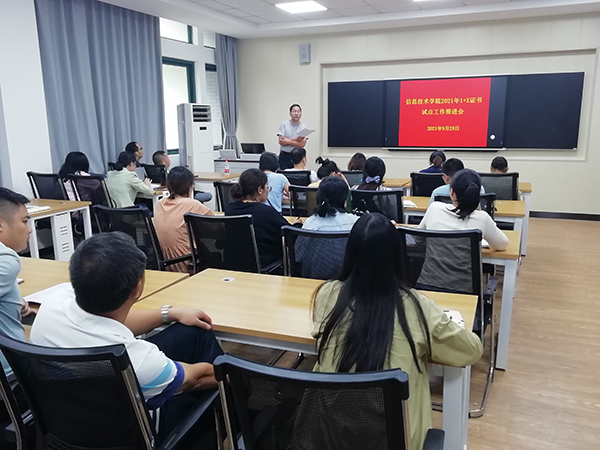 为加强组织管理和统筹协调,更好地推动“1+X”证书制度试点工作,9月29日下午,信息技术学院在2号教学楼206教室召开了2021年“1+X”证书试点工作推进会。各“1+X”证书负责人、培训教师和辅导员参加了会议。会议由信息技术学院副院长熊祖涛主持。