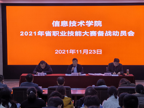 11月23日中午,信息技术学院2021年省职业技能大赛备战动员会在2号教学楼216阶梯教室隆重举行,信息技术学院党总支书记、院长疏国会教授出席会议并讲话,副院长熊祖涛主持会议。学院党政管理人员、专业建设负责人、大赛指导教师和全体参赛学生参加了会议。