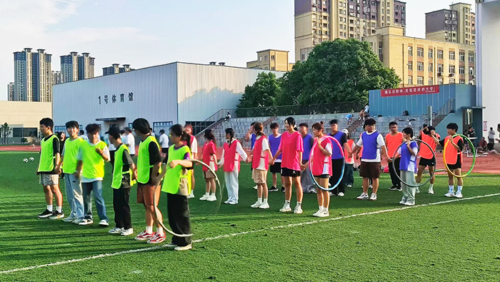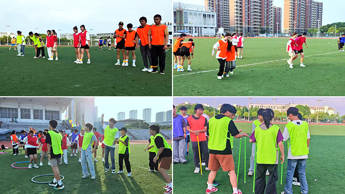 趣味运动会包含不倒森林、一圈到底和两人三足三个赛项,学生们分为四队,分别穿着红、橙、紫、绿的队服,在洒满阳光的绿茵场上,尽情释放青春激情,享受运动乐趣。