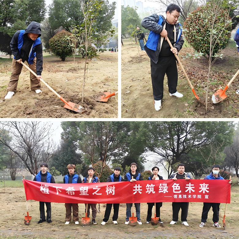 3 月 12 日植树节当天,20余名师生在校园南侧空地开展“植下希望之树,共筑绿色未来”主题活动。活动现场,同学们分工协作,挥锹挖坑、扶苗培土、提水浇灌,合力栽种数行桂花树苗,并悬挂“成长寄语”铭牌。计算机应用技术专业王同学说:“看着自己种下的树苗,更理解了‘绿水青山就是金山银山’的内涵。”