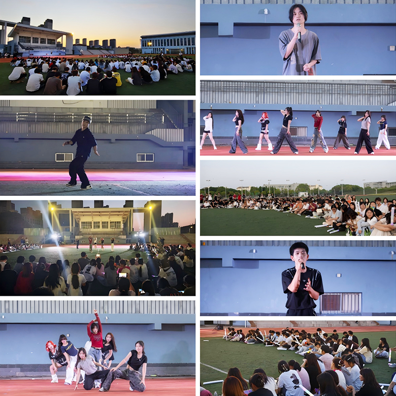 暮色渐浓,微风轻拂着操场的草坪,主持人宣布草地音乐节开始,开场舞《whiplash》音乐响起,由李欣怡带队身着闪亮演出服的舞者们用充满张力的动作瞬间点燃现场气氛,歌唱环节更是惊喜连连,24计算机应用技术1班余佳旺用《第一次爱的人》唤起青春记忆;23大数据技术一班贾梦磊演唱《修炼爱情》,细腻歌声直抵人心;23计算机网络2班王兆丰的《安静》、24数字媒体4班叶思琪的《新贵妃醉酒》等,或深情舒缓,或风格独特,同时台下观众挥舞荧光棒,跟随节奏合唱,操场化作一片音乐的海洋。