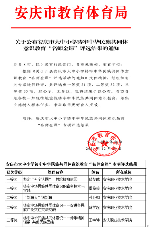 近日,由中共安庆市委高等教育委员会、安庆市教育体育局联合主办的安庆市大中小学铸牢中华民族共同体意识教育“名师金课”评选结果新鲜出炉。我校五位思政课教师凭借扎实的理论功底、创新的教学设计和优秀的教学能力,取得优异成绩。嵇梦成、周稳荣老师获一等奖,孙亚如、陈学超和王吟诗老师获得二等奖,获奖情况在安庆市属院校名列前茅。