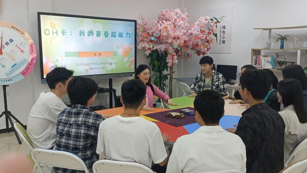 “OH卡——我的青春超能力”团体辅导,心理咨询师通过热身活动、OH卡解读,帮助学生们亲近自己的潜意识,与自己沟通对话,引导其寻找资源,进一步激发自我潜能。