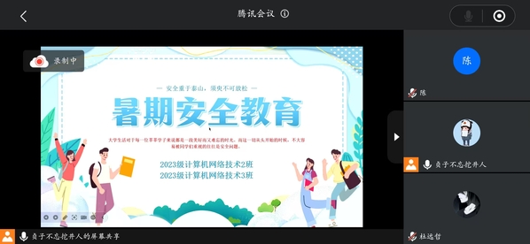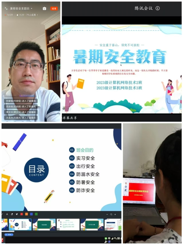 8月初,我校在暑假期间组织开展安全教育线上主题班会活动。本次主题班会活动覆盖全校2022级、2023级共计9000余名学生。活动中,辅导员依托腾讯会议、钉钉、超星教管系统等网络平台,围绕防溺水教育、防诈骗安全教育、交通安全教育、实习安全教育、网络安全教育、食品安全教育、心理健康教育和用水用电以及防火安全教育等有关学生人身和财产安全等多个主题,精心准备了内容丰富、形式多样的线上“云”班会,通过“云直播”的形式,积极开展暑期安全教育宣传。通过活动,有效地提升学生和家长的安全意识,确保假期安全教育取得实效。