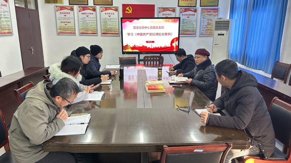 为进一步严明纪律作风,营造风清气正的氛围,1月24日上午,图文信息中心直属党支部组织开展集中学习活动,专题学习新修订的《中国共产党纪律处分条例》,支部书记主持会议并进行导学,全体党员参加会议。