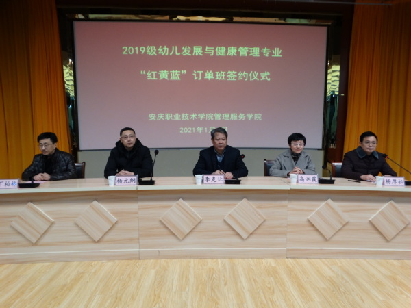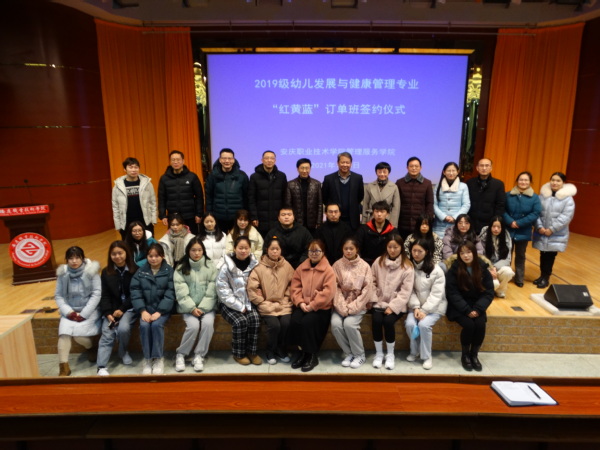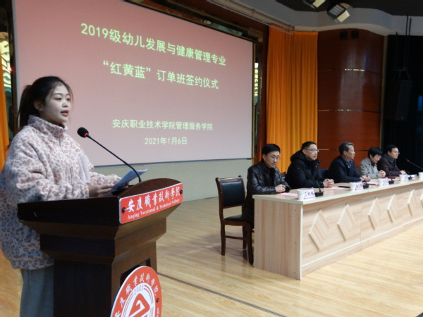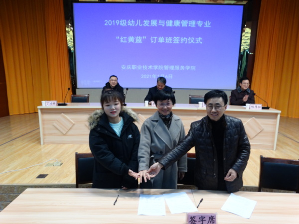 最后,管理服务学院负责人、安庆红黄蓝公司负责人与订单班学生代表举行了现场签约。此次“红黄蓝订单班”成立,是管理服务学院为积极拓宽学生就业渠道,促进专业办学进一步贴近地方社会经济发展的重要举措,得到学校、企业的大力支持和学生的积极响应。(文:冯鲁红    图:李光寿   审核:杨厚松)