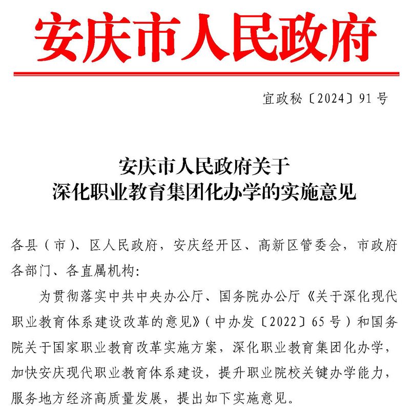 日前,安庆市人民政府出台了《关于深化职业教育集团化办学的实施意见》(宜政秘〔2024〕91号)。《实施意见》是对《关于职业教育集团化办学的实施意见》(宜政秘〔2018〕171号)中的坚持市场导向,深化产教融合,补齐办学短板,加强资源调配等内容,按照最新政策文件要求进行了重新梳理、归类、表述,保留了原有成功措施办法,新增了强化我市产教融合、校企合作平台载体建设内容,更加突出了新形势下职业教育发展的新要求。