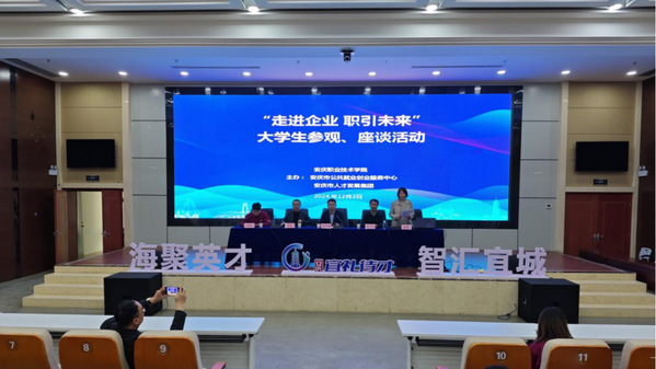 12月2日,我校与安庆市公共就业创业服务中心、安庆市人才发展集团携手主办的“走进企业 职引未来”大学生就业参观、座谈活动在安庆工业园区圆满落幕。安庆市人才发展集团党委书记、董事长王中群,市公共就业创业服务中心主任朱兴茂,我校招生就业处处长桂骏出席座谈活动。我校教学督导与质量管理办公室主任、省级职业指导大师工作室领衔人张铮主持开幕仪式。